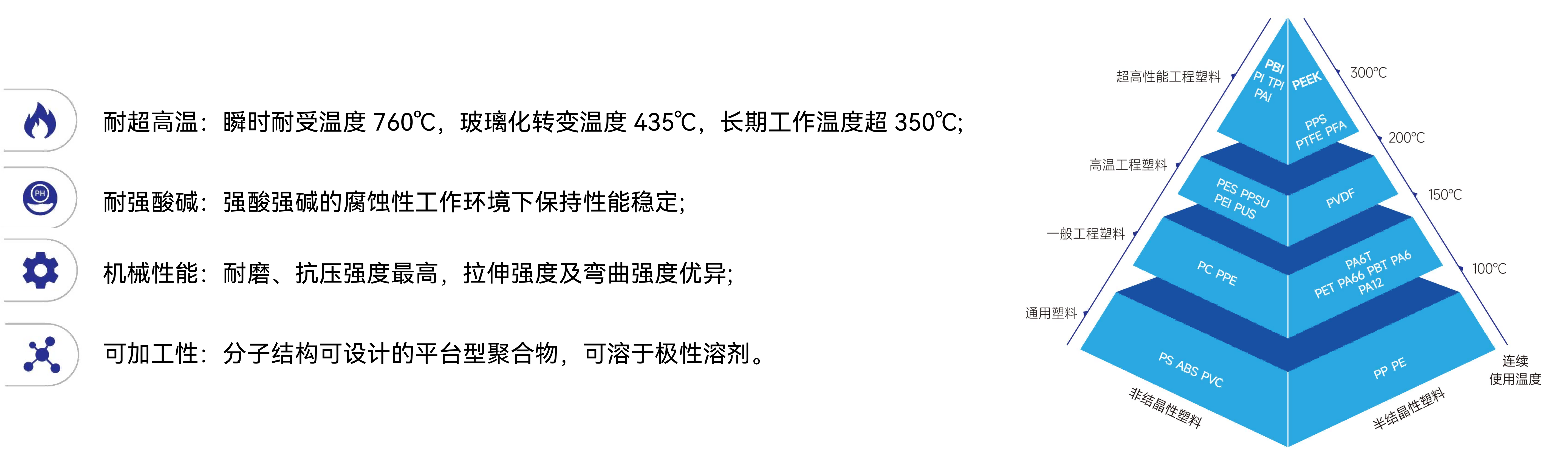 Repazole® PBl聚苯并咪唑樹脂憑借其卓越的綜合性能,在眾多工業領域中展現了無可替代的優勢。其玻璃化轉變溫度高達435℃,能夠勝任其他特種工程塑料難以承受的極端高溫環境,同時因其不熔不燃的特性,可短暫耐受760℃的超高溫。此外,PBI還具備出色的耐強酸強堿性能、優異的機械強度以及良好的電絕緣性,使其成為當今性能最為頂尖的特種工程塑料之一。