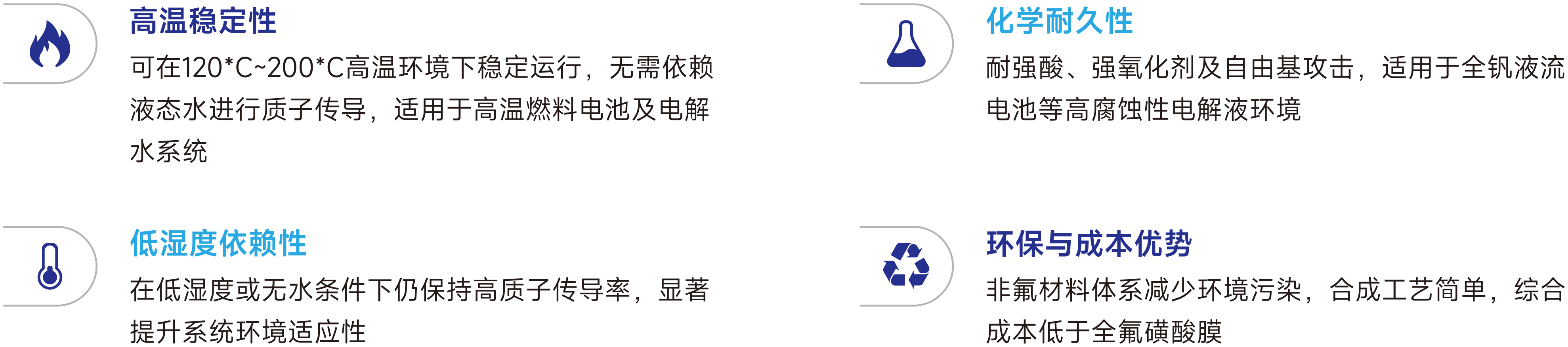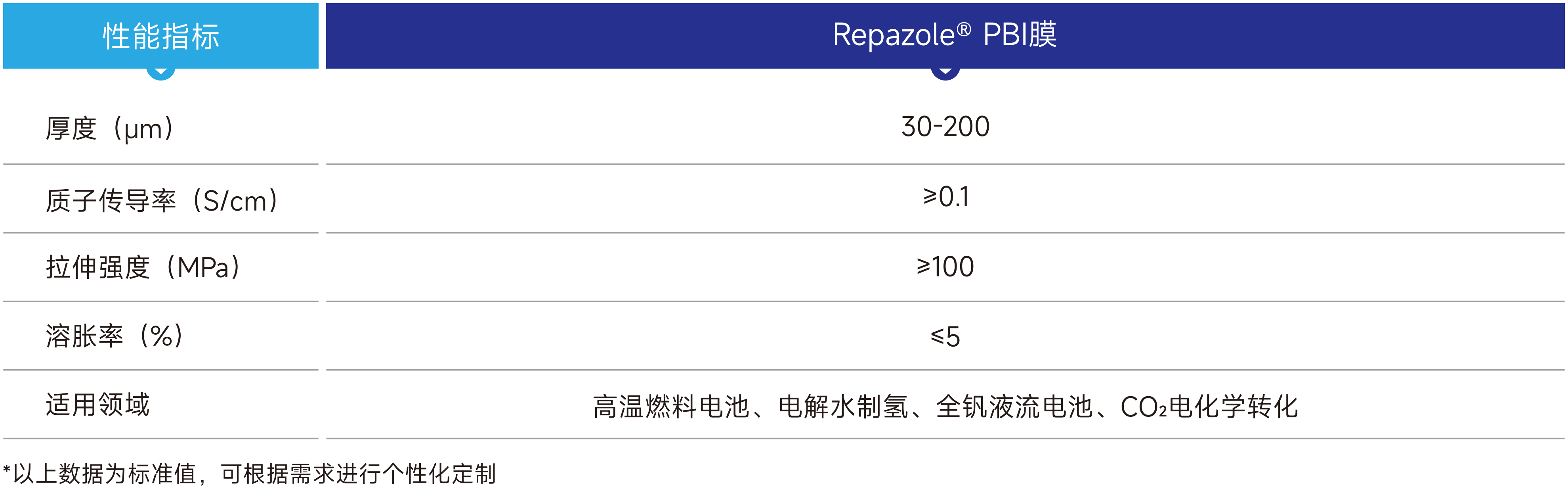 聚苯并咪唑高性能膜材是通過Repazole® PBI樹脂溶液制備而成,憑借優異的加工性、耐高溫性以及耐強酸堿性能,可在工作溫度150℃以上,強酸堿的工作環境中保持性能穩定,并且可與多種材料進行復合制備,滿足氫能領域高溫燃料電池、電解水制氫系統,新型儲能全釩液流電池,CO?電化學轉化,氣體分離及純化等領域的需求。